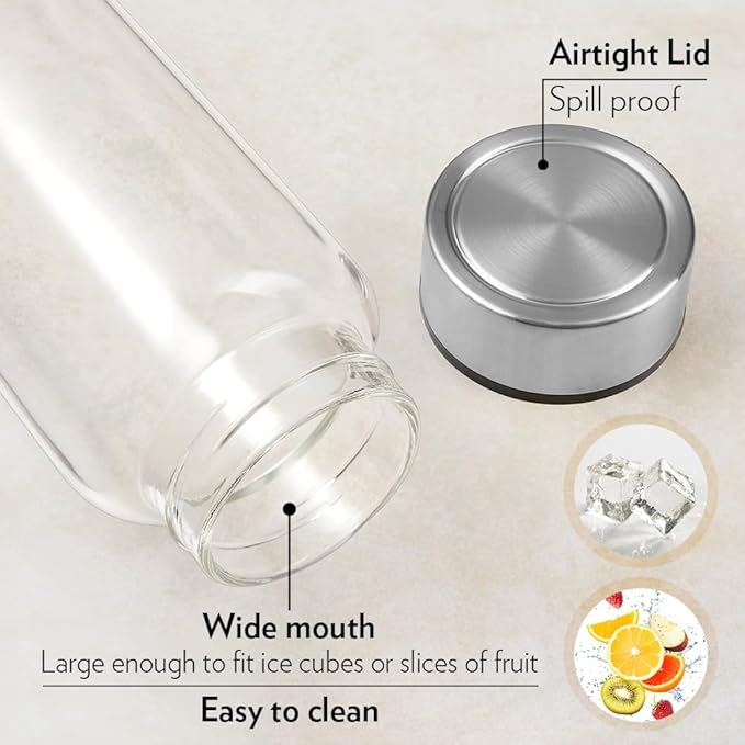 Borosil Crysto Borosilicate Glass Water Bottles, Wide Mouth, Stainless Steel Lid, 1l, Clear