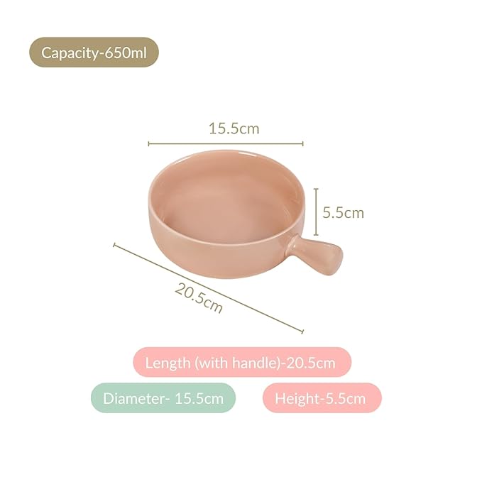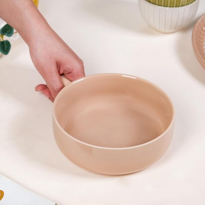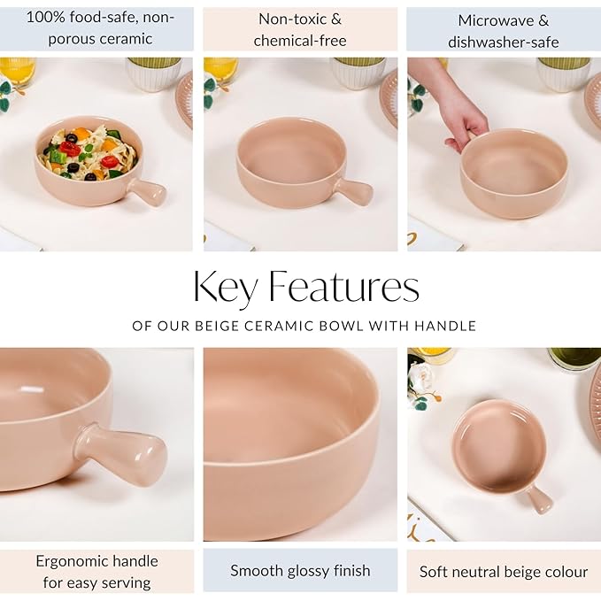 Ceramic Beige Snack Bowl with Handle | Microwave & Dishwasher Safe Serving Bowl Perfect for Snacks, Noodles, Salads, Soup, Baking (650ml)