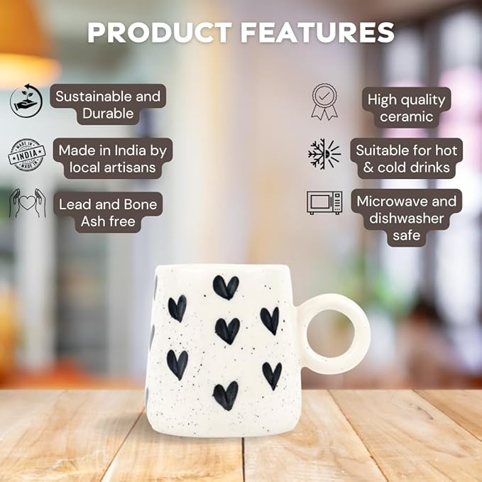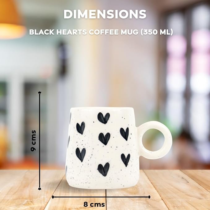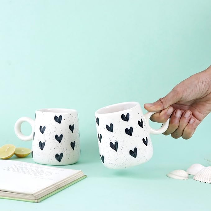 Hand-Painted Coffee mug set of cups | Elegant Ceramic Mug | Microwave & Dishwasher Safe, Perfect for Home & Gifting White Set of 2 (350) ml Black Heart