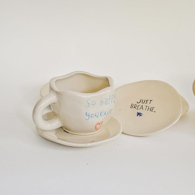 Handmade ceramic small tea cups from QSHI Studio, perfect for coffee, tea, or milk. Cute “Happy You Exist” small tea cups design makes it a heartfelt gift for friends and loved ones.