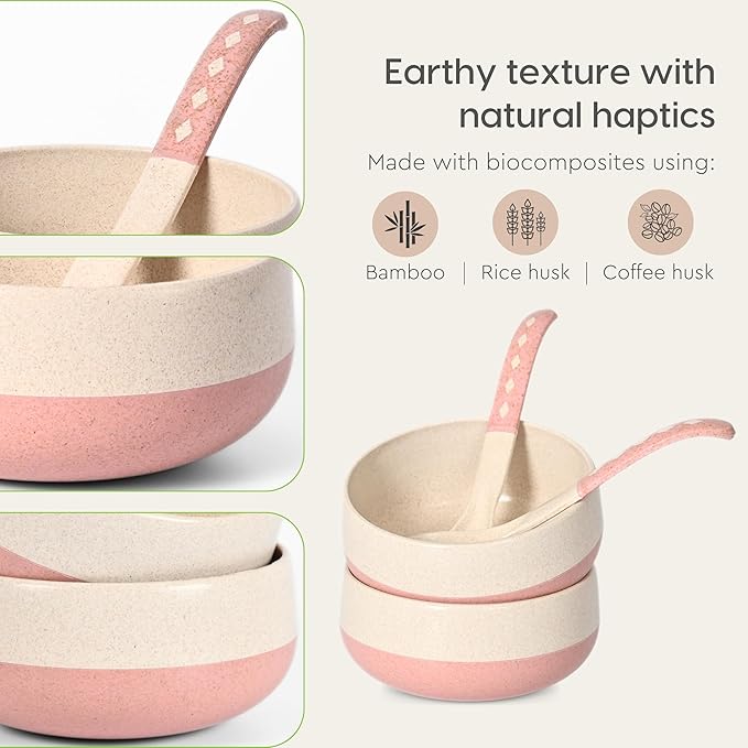 Set of 2 eco-friendly 250 ml soup bowls with spoons, made from rice husk biocomposite — microwave safe in charming pink and off-white.