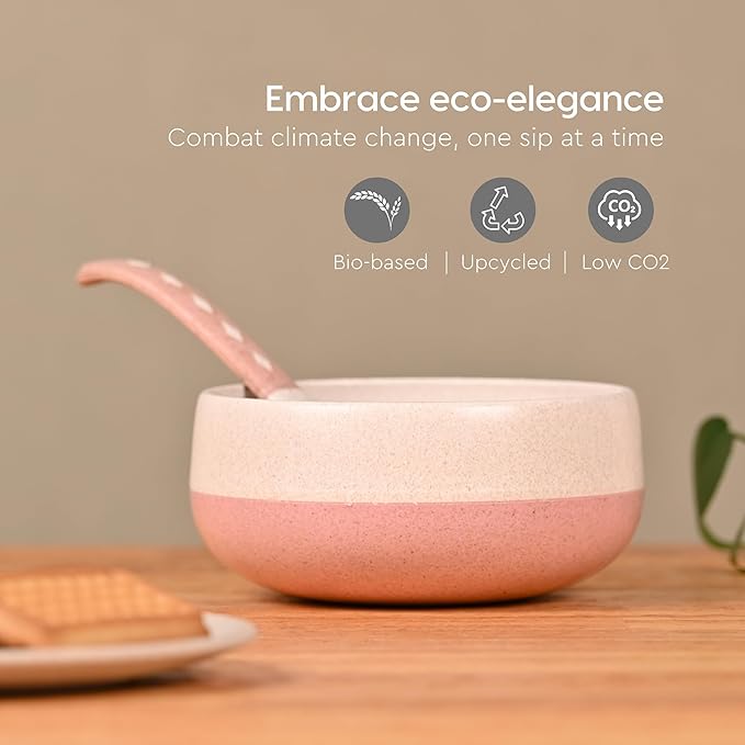 The spoons that accompany these soup bowls with spoons are designed to complement the bowls perfectly. Crafted from the same Agri-waste derived biocomposite material, they share the same earthy texture and pastel hues. The spoons are shaped for functionality, with a well-proportioned bowl that is ideal for sipping broth and a comfortable handle that rests easily in the hand. Using a matching set of bowl and spoon creates a unified and aesthetically pleasing table setting that is both stylish and sustainable.
